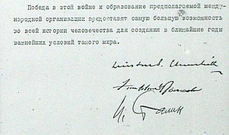 Vertrag mit Unterschriften von Churchill, Roosevelt und Stalin